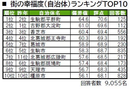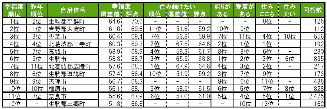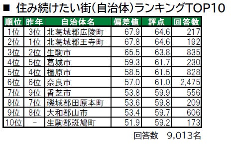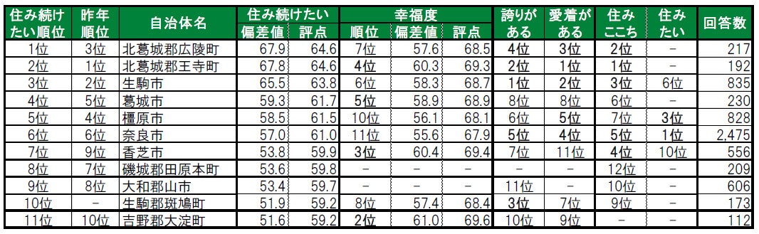1位は北葛城郡広陵町で、昨年3位から順位を上げました。2位は北葛城郡王寺町で、トップ2は北葛城郡に属する町という結果になっています。3位は生駒市です。トップ3は、「住みここち(自治体)」でも上位3位にランクインしている自治体です。