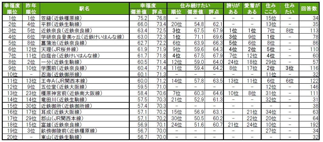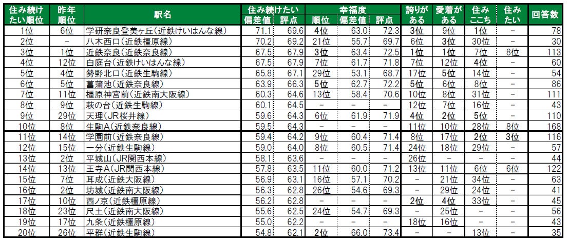 •駅ランキング:1位笠縫(近鉄橿原線)、10位忍海(近鉄御所線)、20位東山(近鉄生駒線)は、2020年~2024年の累計回答数が30名未満で、「住み続けたい」「誇りがある」「愛着がある」ランキングの集計対象外となっているため、「-」と表示しています。