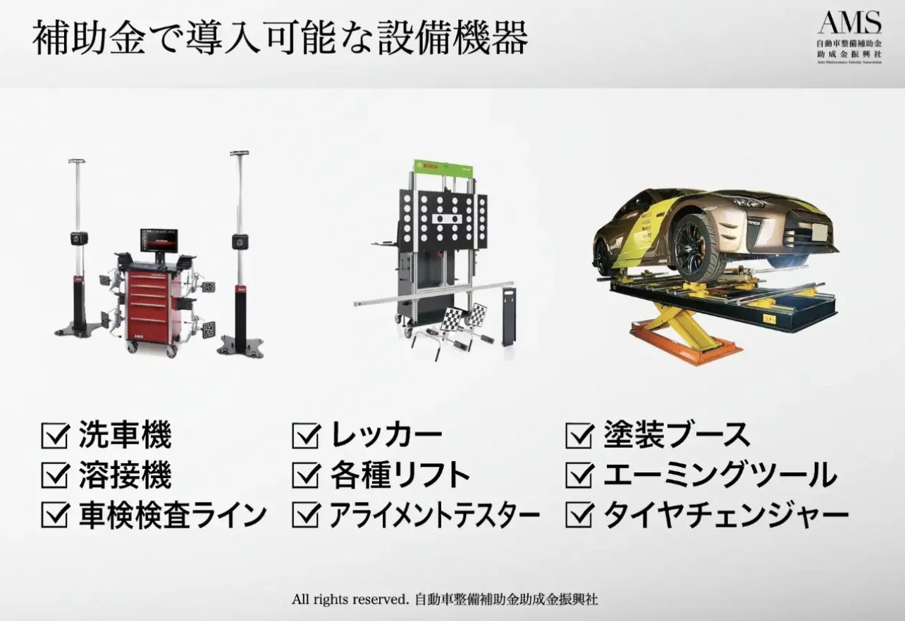 エーミング機器、アライメントテスター、塗装ブース、リフト、フレーム修正機・測定器、レッカー、洗車機、車検検査ライン、タイヤチェンジャー、その他各種自動車整備機器