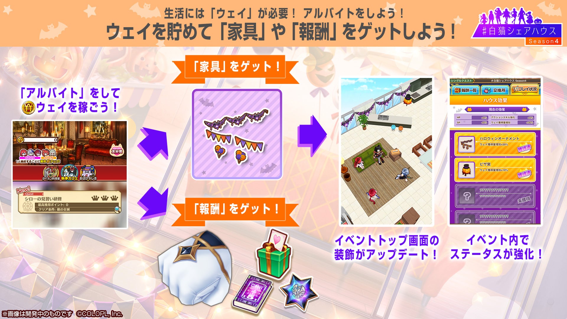 イベントクエストではバイトクエストという、キャラクターたちのアルバイトを追体験できるものをご用意いたしました。こちらのクエストをクリアすると「ウェイ」というゲーム内通貨を獲得でき、集めた「ウェイ」の数によってシェアハウスにハロウィン風の家具や置物などが置かれていきます。またバイトクエストを進めると各キャラクターの友好度が上昇し、特別なストーリーが解禁されます。