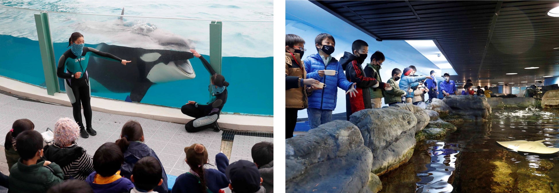 本プログラムでは鴨川シーワールドで飼育している動物たちをテーマに、担当の飼育員やトレーナーがわかりやすく解説し、本物の動物を間近に見ることで海の生き物について楽しく学ぶことができます。さらに、参加者には当館の従業員も着用しているオリジナルマスクをプレゼントし、みなさんお揃いのマスク姿で授業に臨みます。