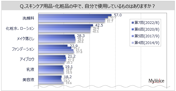 | <今 回>(2022/8)https://myel.myvoice.jp/products/detail.php?product_id=28909 ※上記設問の他に「行っているスキンケア」「選定時の重視点」「コロナ禍で買い替えたもの・選び方が変わったもの」も聞いています。 <第6回>(2020/8)https://myel.myvoice.jp/products/detail.php?product_id=26511 <第5回>(2017/9)https://myel.myvoice.jp/products/detail.php?product_id=23012 |