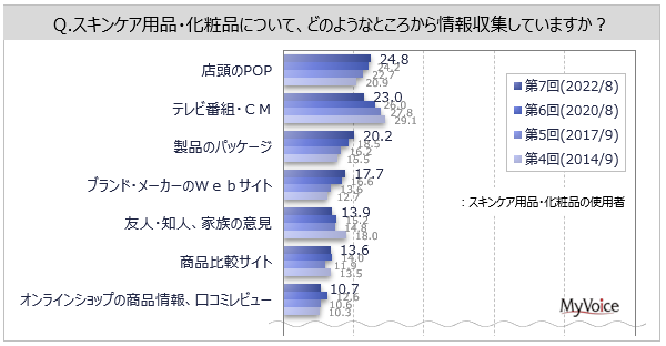 【化粧品に関する調査】スキンケア用品・化粧品の情報源は「店頭のPOP」「テレビ番組・CM」など。女性若年層では「Twitter、インスタグラム、YouTubeなど」の比率高い