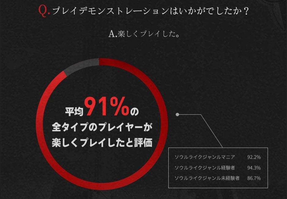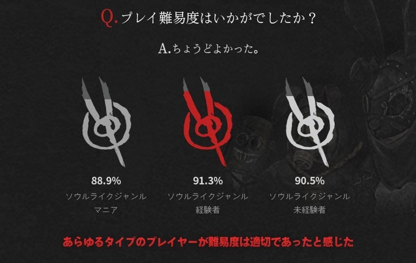 ソウルライクジャンルを経験したことがあるユーザーのうち、 91.3%はゲーム難易度に対して「適切だ」と回答いただき、このジャンルのマニア及び未経験者もプレイ難易度についてそれぞれ90.5%、 88.9%と肯定的に答えました。