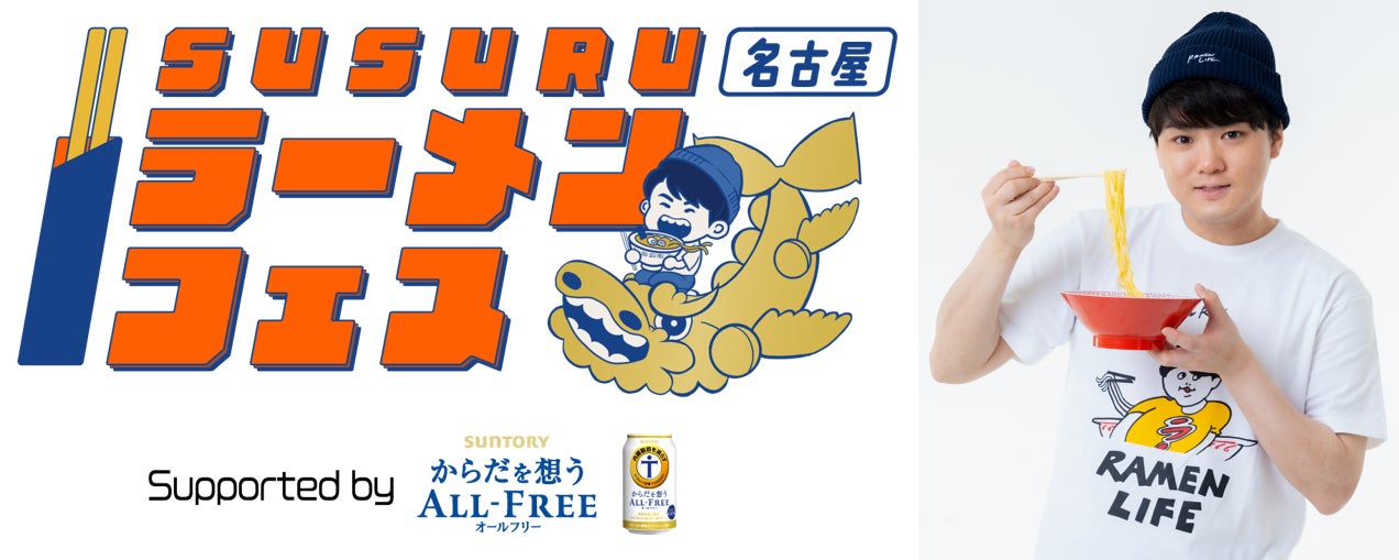 メ~テレ(名古屋テレビ放送)と株式会社SUSURU LAB.は、9月27日(金)〜10月1日(火)の5日間、「SUSURUラーメンフェス名古屋 supported by サントリーからだを想うオールフリー」を久屋大通公園エディオン久屋広場にて開催します。登録者数161万人超えの人気ラーメンYouTuber・SUSURUが全国4,500店舗以上のラーメン店から厳選したラーメンを一度に楽しめるイベントです。