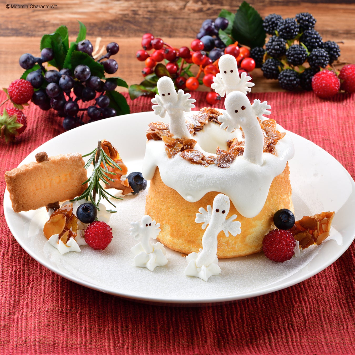 優しいくちどけのシフォンケーキの上には生クリームと落ち葉に見立てた香ばしいキャラメリゼ、かわいらしいメレンゲのニョロニョロをトッピングしました。ケーキに添えたブルーベリーとクランベリーは秋の実りを演出します。メレンゲのニョロニョロたちが奇数で行動しているか、数えてみるのも楽しい秋の一品です。
