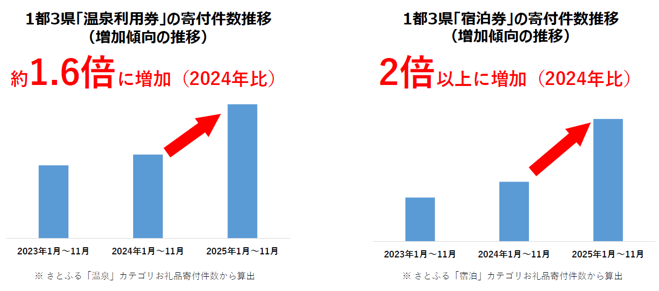 2023年以降、「温泉・宿泊」に関するお礼品の寄付件数は増加傾向にあり、2025年はその傾向がより顕著に表れています。こうした傾向は、東京都・神奈川県・埼玉県・千葉県の1都3県全体にも共通しています。2025年1月~11月の寄付件数をみると、「温泉利用券」は前年同期比で約1.6倍、「宿泊券」は2倍以上となりました。さらに、年末にあたる2024年11月~12月においても、「温泉利用券」「宿泊券」ともに寄付件数は前年同期比で約1.5倍となっており、通年でみられた需要拡大の傾向が年末に入っても継続していることがうかがえます。