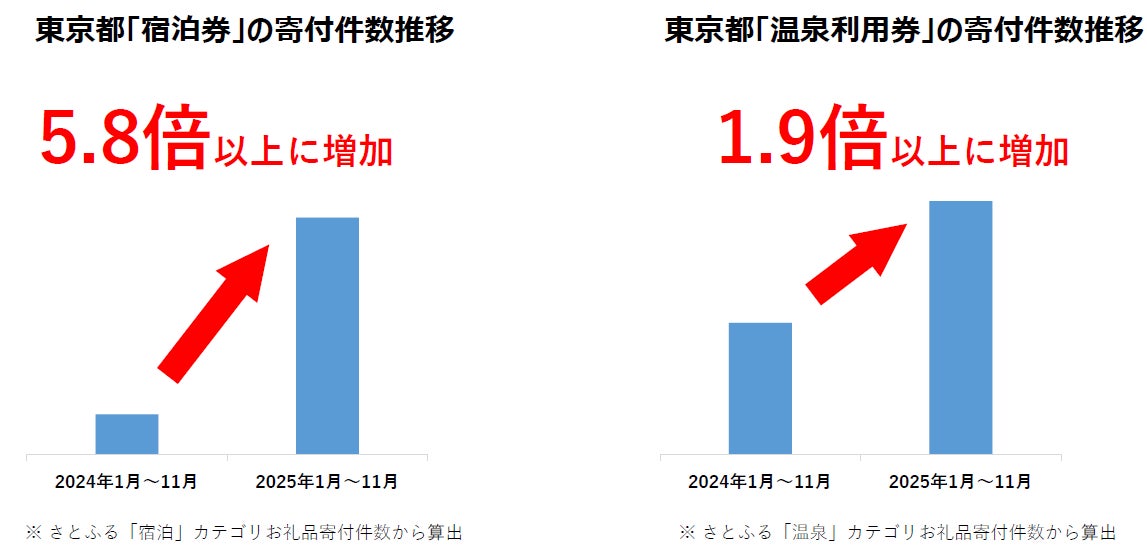 東京都における2025年1月~11月の「宿泊券」お礼品への寄付件数は、前年同期比で5.8倍以上と大きく伸長しました。あわせて、「温泉利用券」お礼品の寄付件数も前年同期比で1.9倍以上となり、いずれも好調に推移しています。