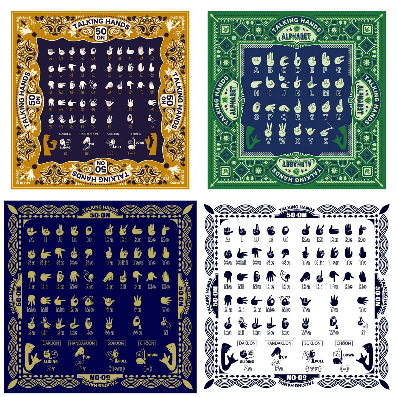 飾っても楽しいおしゃれな50音の指文字デザインのハンカチやバンダナ。
