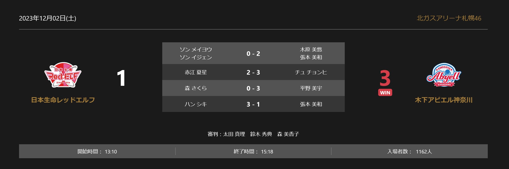 ノジマTリーグ 2023-2024シーズン 公式戦 12月2日開催 日本生命レッドエルフ vs 木下アビエル神奈川の試合は、3-1で木下アビエル神奈川が勝利しました。