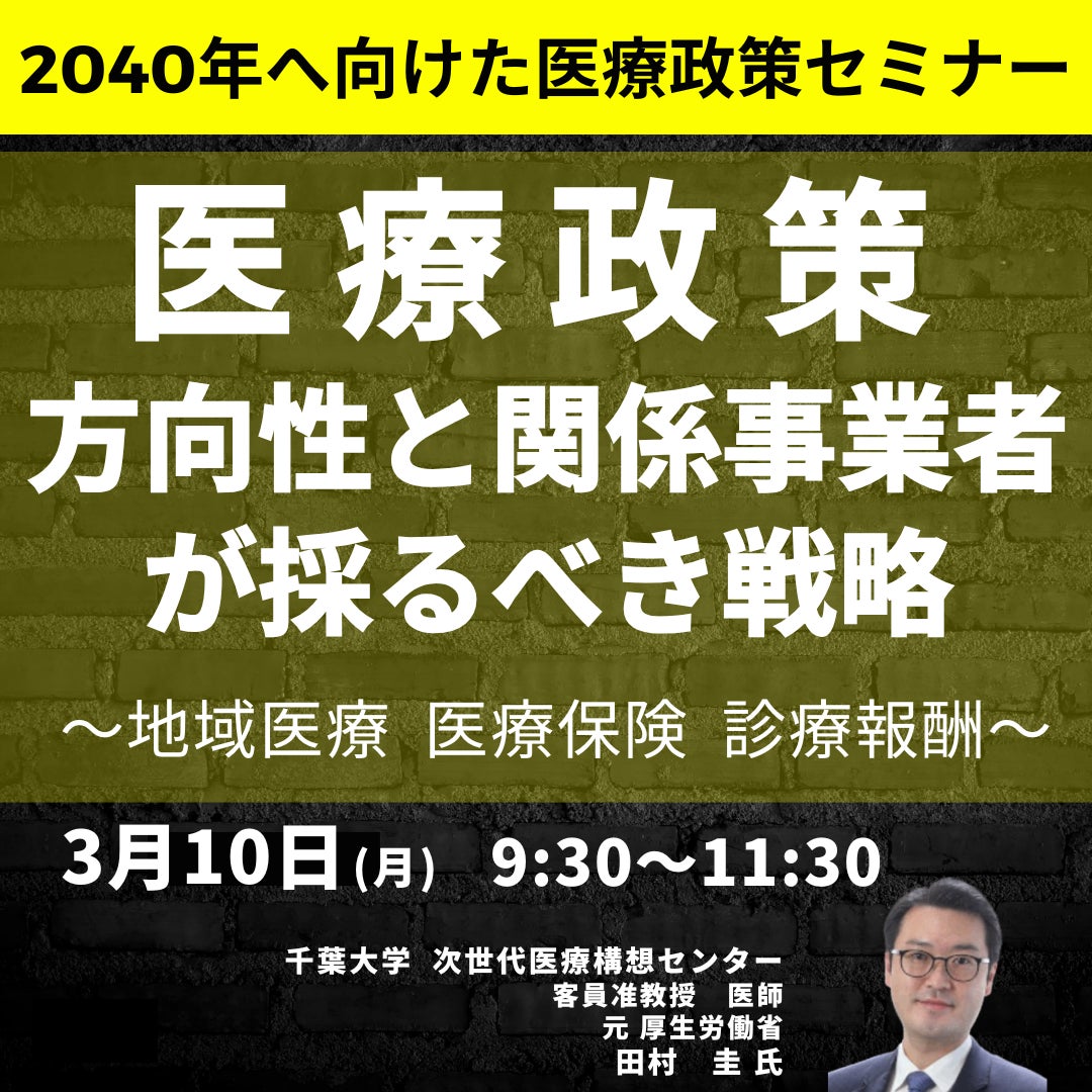 JPI(日本計画研究所)は、千葉大学 次世代医療構想センター 客員准教授 医師 元 厚生労働省 田村 圭 氏を招聘し、2040年へ向けた医療政策の方向性と関係事業者が採るべき戦略について詳説いただくセミナーを開催します。