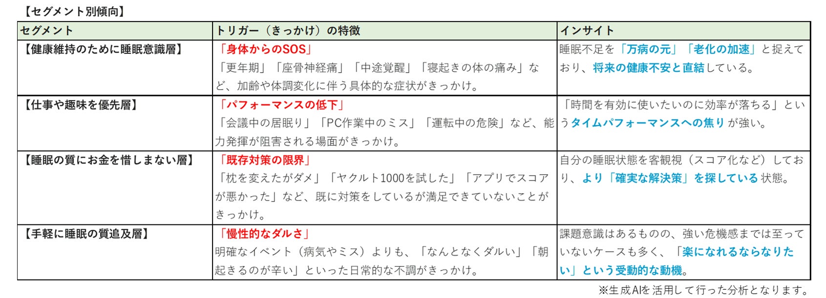 セグメント別にも特徴が出ており、特に「手軽に睡眠の質追及層」では、「慢性的なダルさ」を自覚しているにも関わらず、積極的に改善したい欲求というよりも、「楽になれるならなりたい」といった受動的なインサイトがみられました。