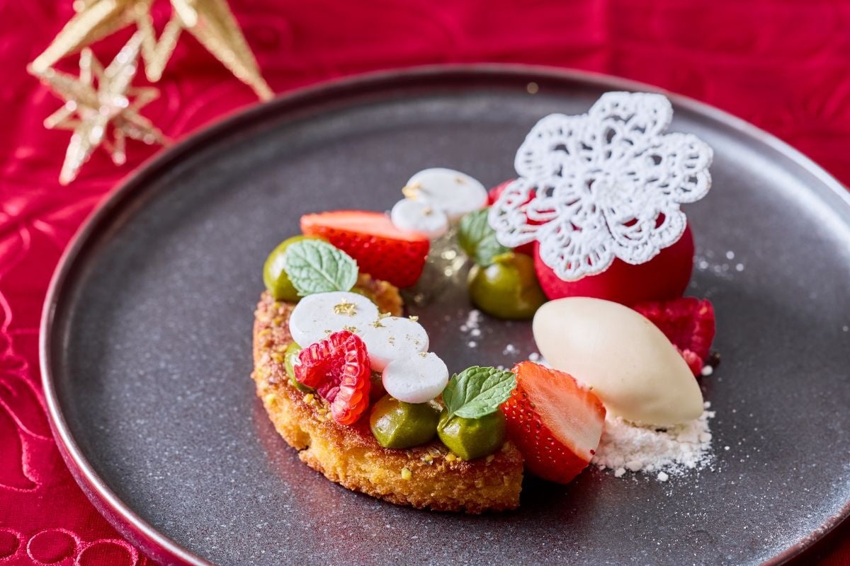 本コースは、オマール海老や雲丹・鰤・オシェトラキャビアなど魚介をカクテル仕立てにし、コンソメジュレと召し上がっていただく冷前菜から始まり、香ばしく焼き上げたフォアグラに、香り高いトリュフを贅沢に削った温前菜、お魚料理は、しっとりと蒸し上げた寒平目を旨味たっぷりのイベリコ・ベジョータの生ハムと合わせ、仕上げに柚子香るスープを添えることで、豊かな風味と調和を感じていただけます。お肉料理は、時間をかけてじっくりとローストした松阪牛のランプ肉と付け合わせの十六穀米のガレットを、コンソメソースとワサビでさっぱりとした味わいをお楽しみいただけます。お食事の最後を飾る、クリスマスリースに見立てた苺やピスタチオを使用したデザートは、見た目も可愛らしく、心ときめくお食事になること間違いなしのおすすめの一品です。