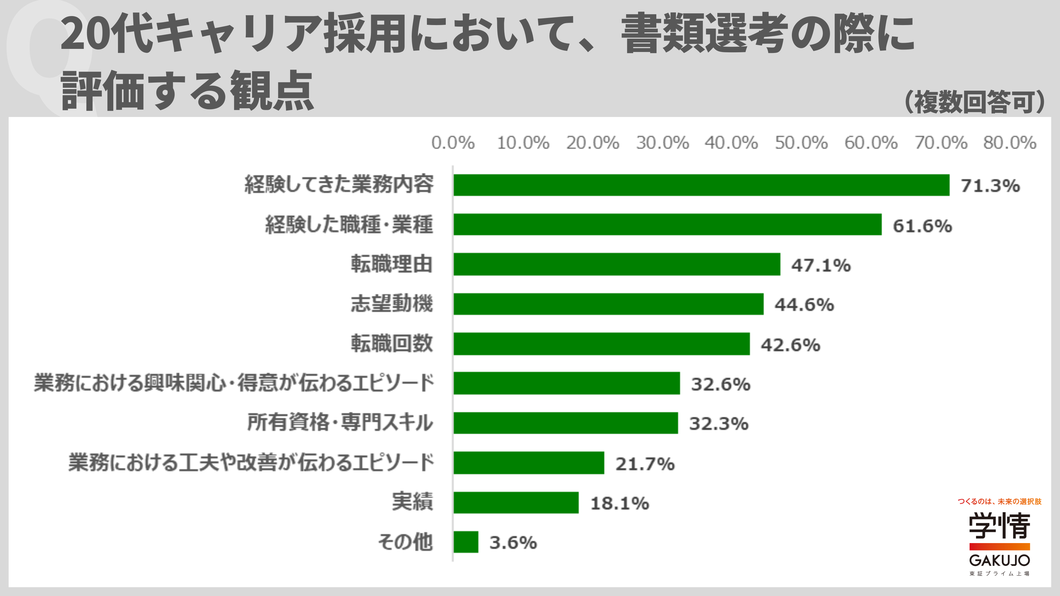 20代を対象にしたキャリア採用で、書類選考の際に見ているポイントは、「経験してきた業務内容」が71.3%で最多。次いで、「経験してきた職種・業種」61.6%、「転職理由」47.1%が続きました。