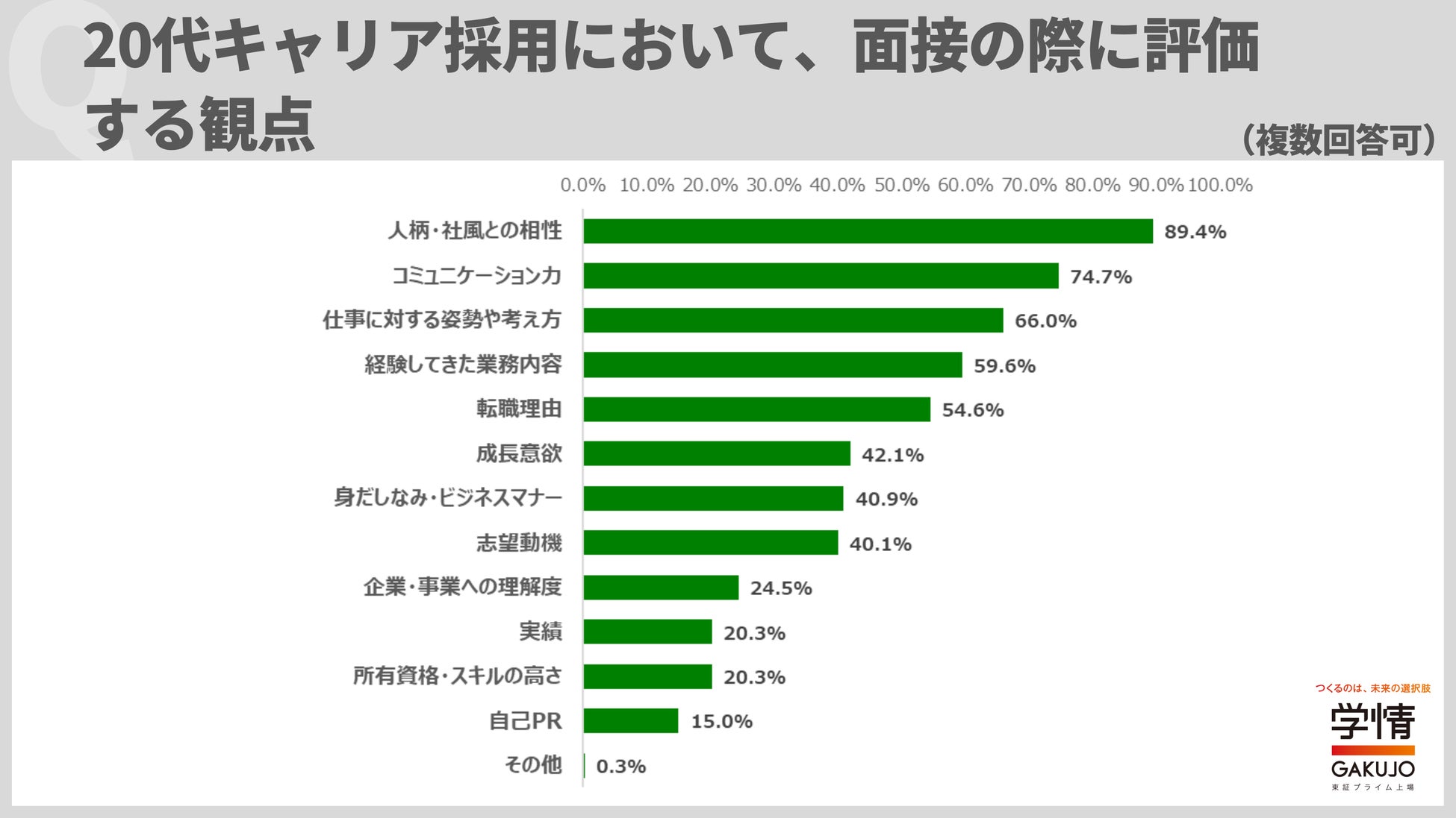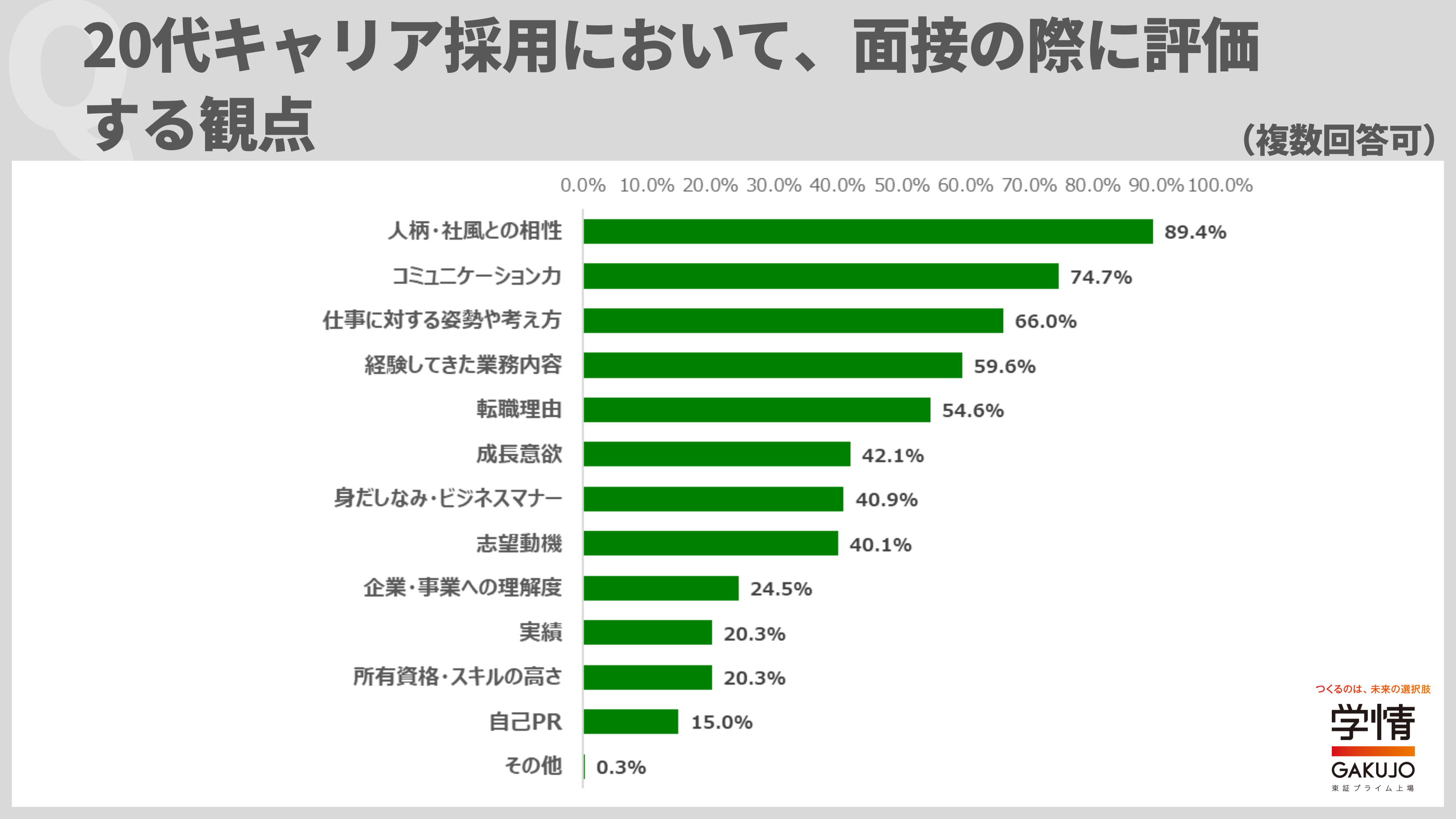 20代を対象にしたキャリア採用において、面接の際に評価するポイントは、「人柄・社風との相性」が89.4%で最多。次いで、「コミュニケーション力」74.7%、「仕事に対する姿勢や考え方」66.0%、「経験してきた業務内容」59.6%が続きました。「経験した業務内容」を押さえ、「人柄・社風との相性」「コミュニケーション力」「仕事に対する姿勢や考え方」がトップ3となっており、ポテンシャルを重視した採用を実施する企業が多いことがうかがえます。