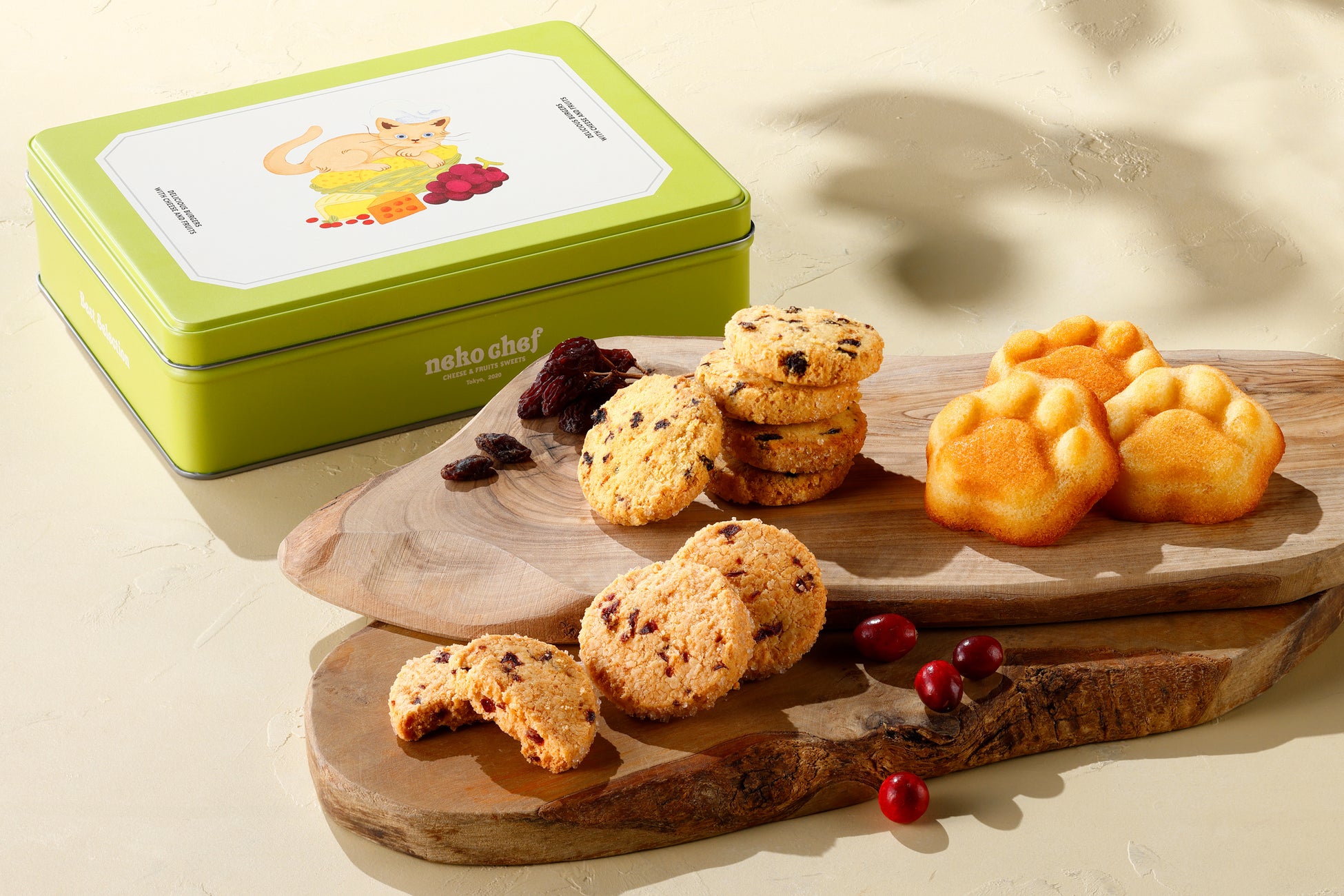 フィナンシェは、カマンベールを練り込んだ薫り豊かな生地に、レモンピールを加えた爽やかな味わいに仕上げました。クッキーは、果実の食感とともに生地のホロホロ食感をお楽しみいただけます。どちらもネコシェフで定番となっている大人気商品です!