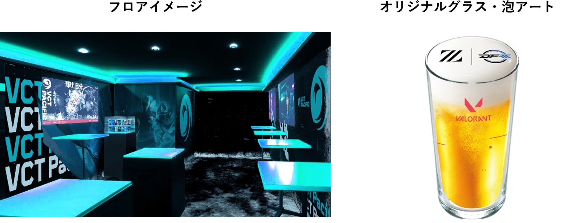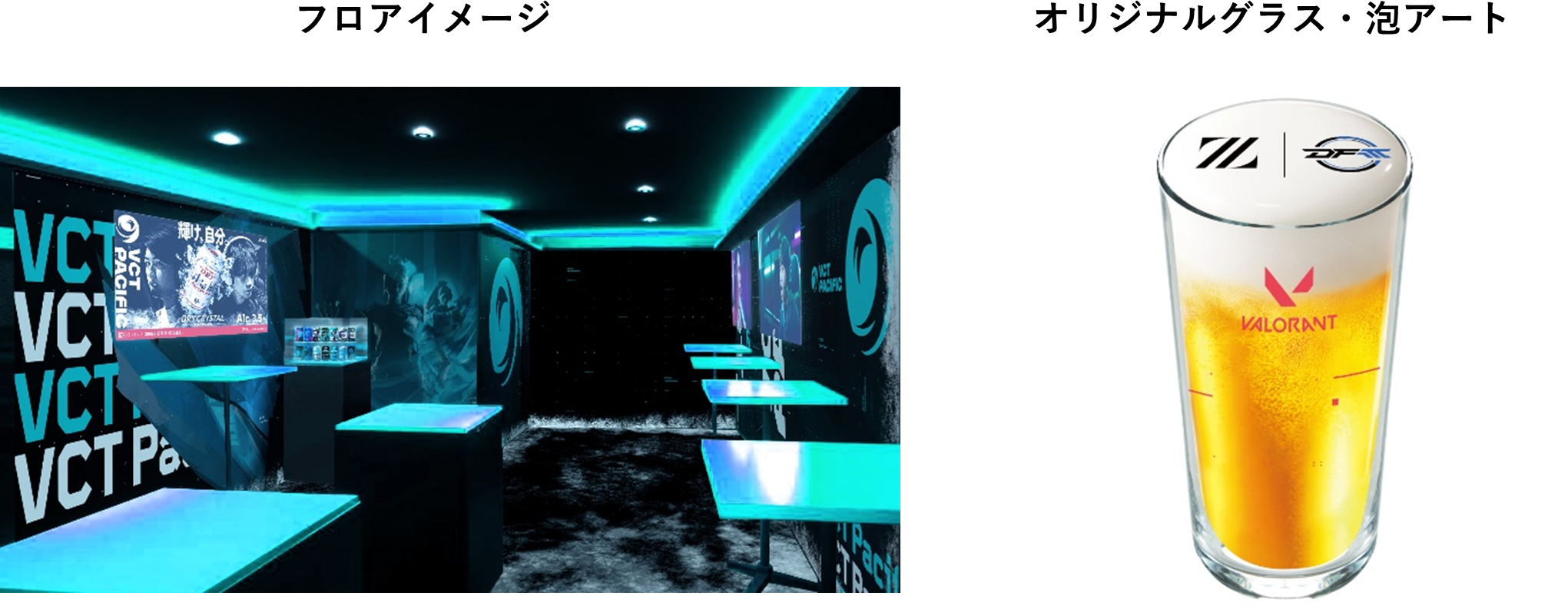 期間中は「VALORANT」のオリジナルデザイングラスでビールを提供するほか、オリジナル泡アートなどが楽しめます。7月20日と21日には、「VALORANT」のインターナショナルリーグ『VALORANT Champions Tour Pacific 2024』で、各地区から勝ち上がった選手が参加する「Playoff Finals」の試合をコンセプトショップ内で生中継するイベントを実施します。