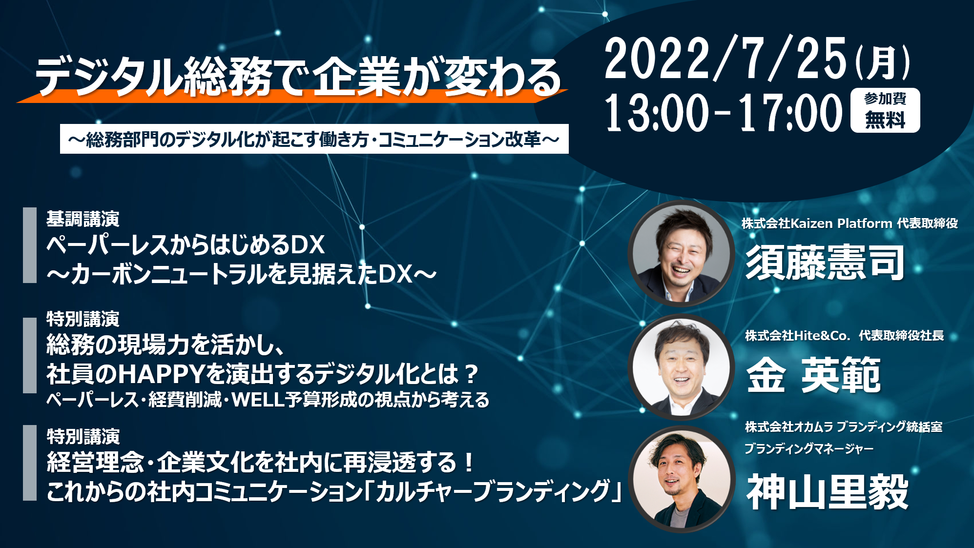 続く特別講演では、株式会社Hite&Co.代表取締役社長の金英範氏が、ペーパーレス・経費削減・WELL予算形成の視点から考える「社員を幸せにするDX戦略」をテーマに登壇。さらに、株式会社オカムラ・ブランディング統括室の神山里毅氏が、経営理念・企業文化を社内に再浸透させるこれからの社内コミュニケーション「カルチャーブランディング」について語ります。