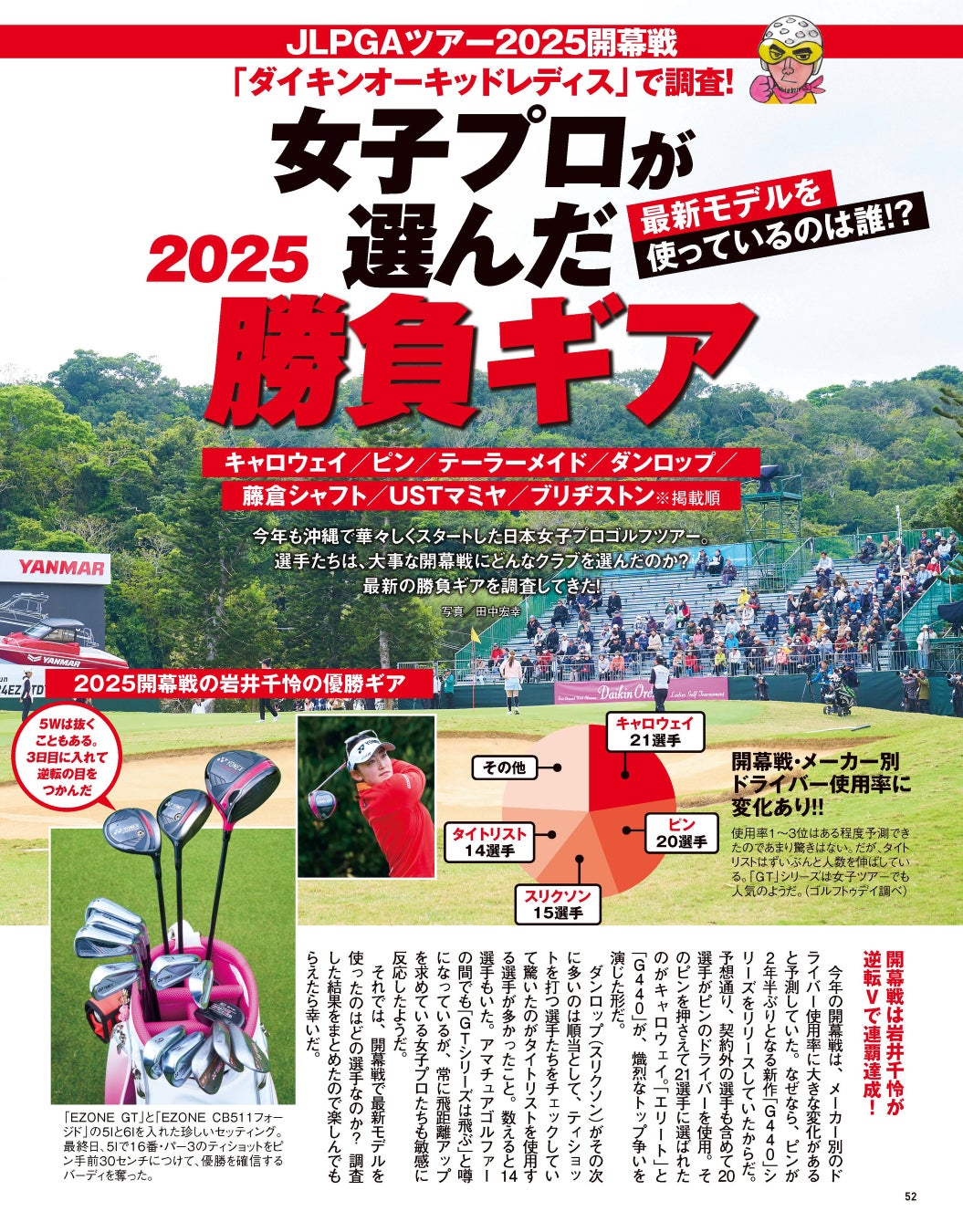注目特集は「女子プロの勝負ギア2025」 。男子プロよりひと足早く、日本では女子ツアーが開幕! そこで彼女たちが今年の相棒として選んだクラブは? ボールは? ツアー会場で見つけた最新情報とともに紹介!