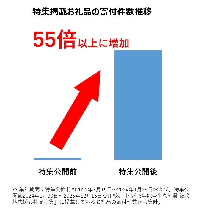 ※3 集計期間:特集公開前の2022年3月15日~2024年1月29日、および特集公開後の2024年1月30日~2025年12月15日を比較。「令和6年能登半島地震 被災地応援お礼品特集」に掲載しているお礼品の寄付件数から集計