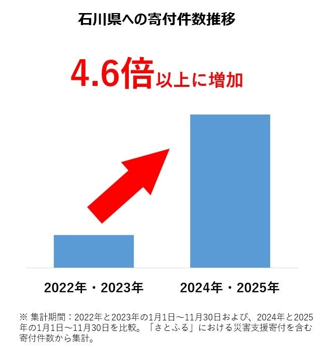 ※1 集計期間:2022年と2023年の1月1日~11月30日、および2024年と2025年の1月1日~11月30日を比較。「さとふる」における災害支援寄付を含む寄付件数から集計