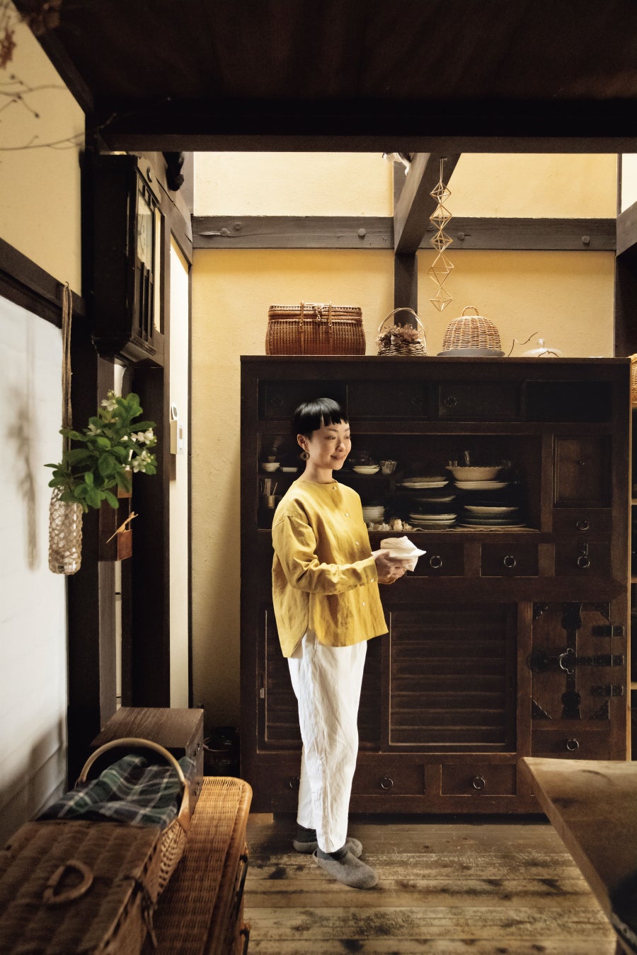 住まいと隣り合う町家の一室を改装し、古い机や大好きなかごを組み合わせて使い