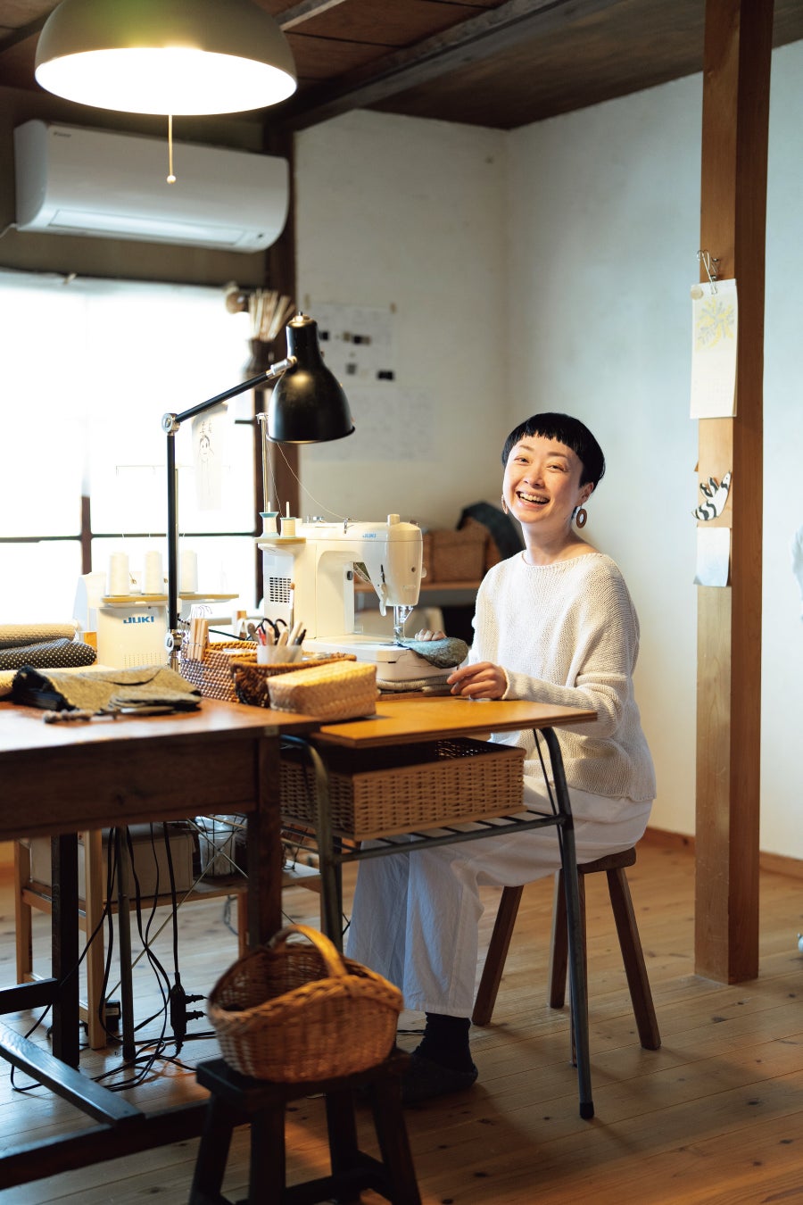 アトリエで服や布小物を手づくりする美濃羽さん。