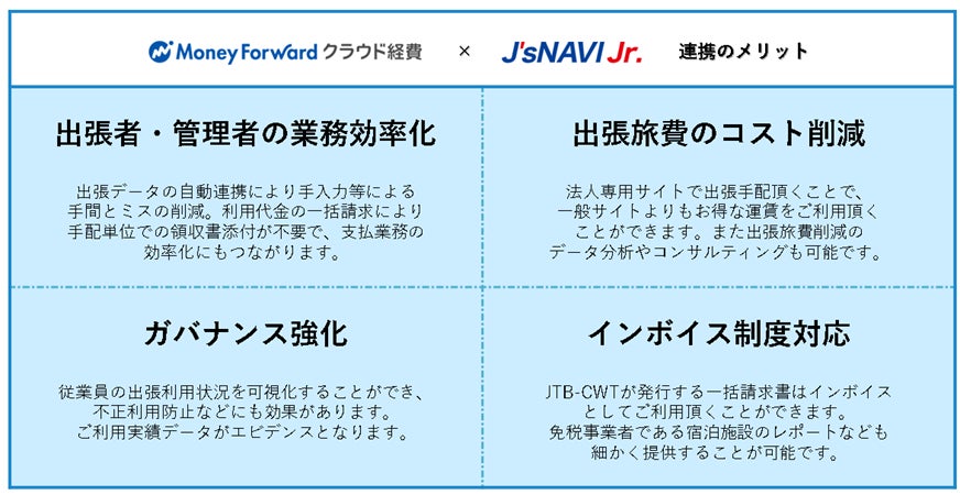 JTBグループで経費データ連携プラットフォーム『J’sNAVI Jr.(ジェイズナビジュニア)』を提供する株式会社JTBビジネストラベルソリューションズ(本社:東京都江東区、代表取締役社長執行役員:原田 雅裕/以下 「JTB-CWT」)は、株式会社マネーフォワード(本社:東京都港区、代表取締役社長CEO辻 庸介、以下マネーフォワード)が提供する『マネーフォワード クラウド経費』とのAPI連携を開始いたしました。