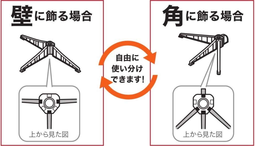①ツリーの脚を組み替えるだけで、壁でも角でもピッタリ置ける省スペースツリー。ハーフツリーとしてもクォーターツリーとしても飾っていただけます。