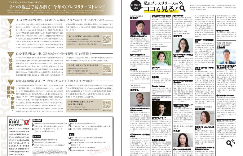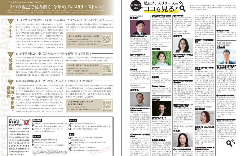 プレスリリースアワード2022は、エントリーいただいた総計1412件より、一次審査を通過したプレスリリース44件すべてに、審査員がノミネートした理由やその他意見をフィードバックさせていただきました。また、プレスリリース発信の参考にしていただけるよう、審査員がプレスリリースを見るポイント、ノミネートされたプレスリリースに対するコメントをまとめた冊子をお送りさせていただきます。これは、ノミネート企業だけでなく、エントリーいただきましたすべての希望者を対象としています。