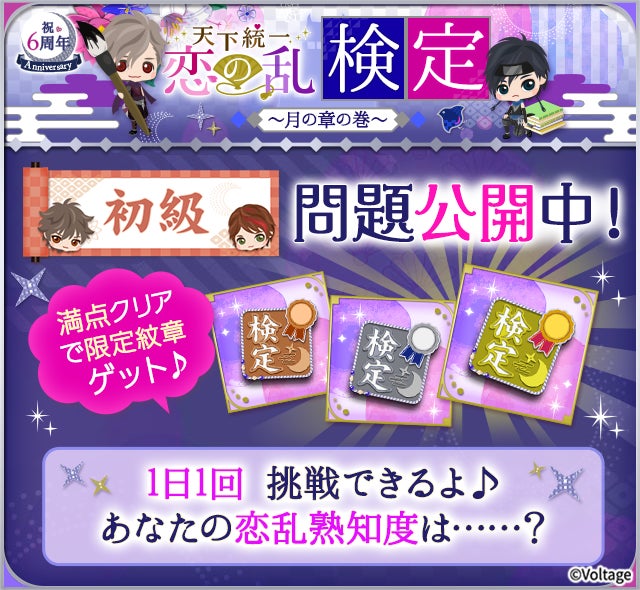 問題は、初級編、中級編、上級編と順に公開されます。各級1日1回挑戦できるので、恋乱熟知度を試してくださいね!