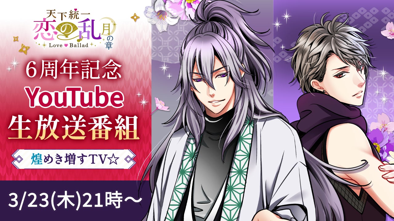 「天下統一恋の乱 Love Ballad ~月の章~」6周年記念・特別生配信番組です。佐藤拓也さん・白井悠介さんをお迎えして、トークだけでなく生アフレコなど周年ならではの豪華企画をお届けいたします。さらに!番組をリアルタイムで視聴していただくと、特別なプレゼントも…!?お楽しみに!