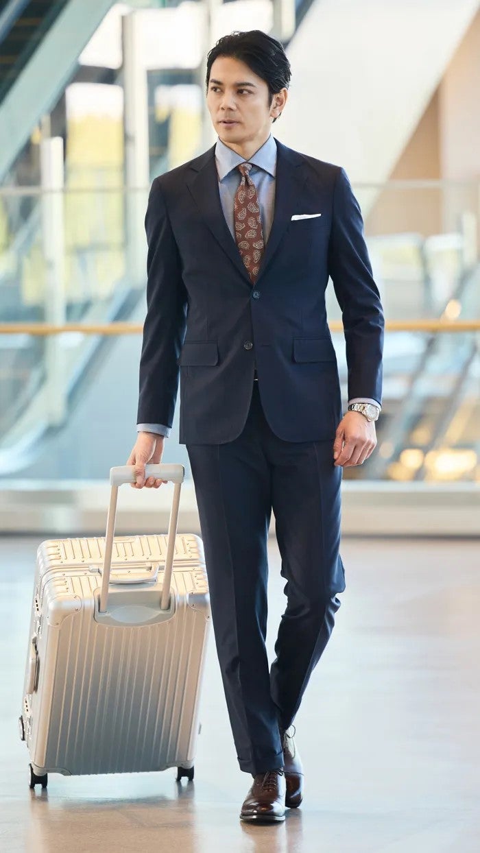 ワードローブに欠かせないネイビースーツは、着用頻度が高いからこそ着心地にこだわりたいもの。防シワ性と撥水性を備えた人気の[TRAVEL COMFORT]シリーズなら、機能性とスーツとしての着映えを両立。飛行機や新幹線での出張からデスクワークまで様々なシーンで活躍します。部下同伴の出張ならペイズリー柄のネクタイで大人の余裕を演出。ネイビー・ブルー×ブラウンは鉄板の色合わせです。