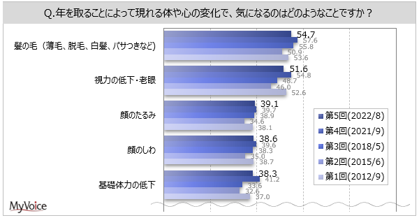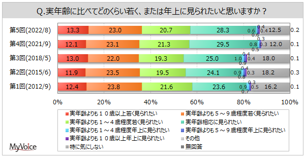 | <今 回>(2022/8)https://myel.myvoice.jp/products/detail.php?product_id=28910 ※上記設問の他に「加齢への抵抗感」「アンチエイジングの関心度」「心身の変化・衰えについての考え方」も聞いています。 <第4回>(2021/9)https://myel.myvoice.jp/products/detail.php?product_id=27808 <第3回>(2018/5)https://myel.myvoice.jp/products/detail.php?product_id=23811 |