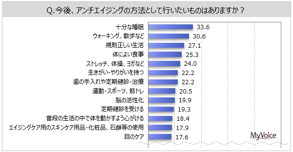 ■アンチエイジングとして行いたいものは、「十分な睡眠」「ウォーキング、散歩など」「規則正しい生活」が3割前後