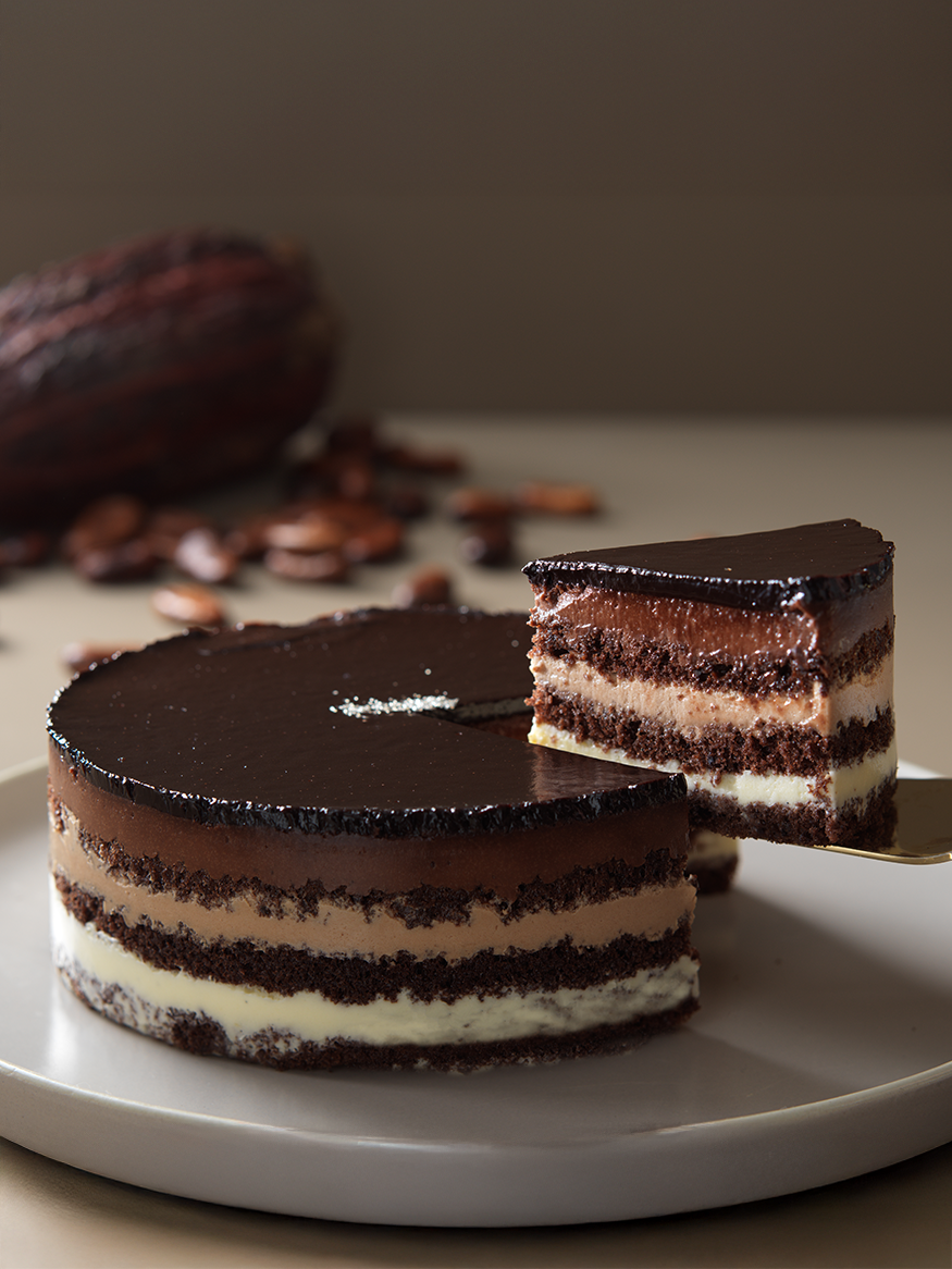 3種類のカカオをそれぞれの特性に合わせて作った、三層仕立てのムースケーキ。