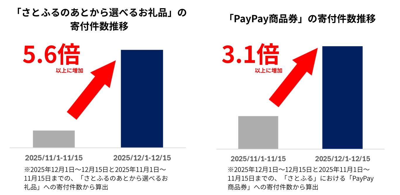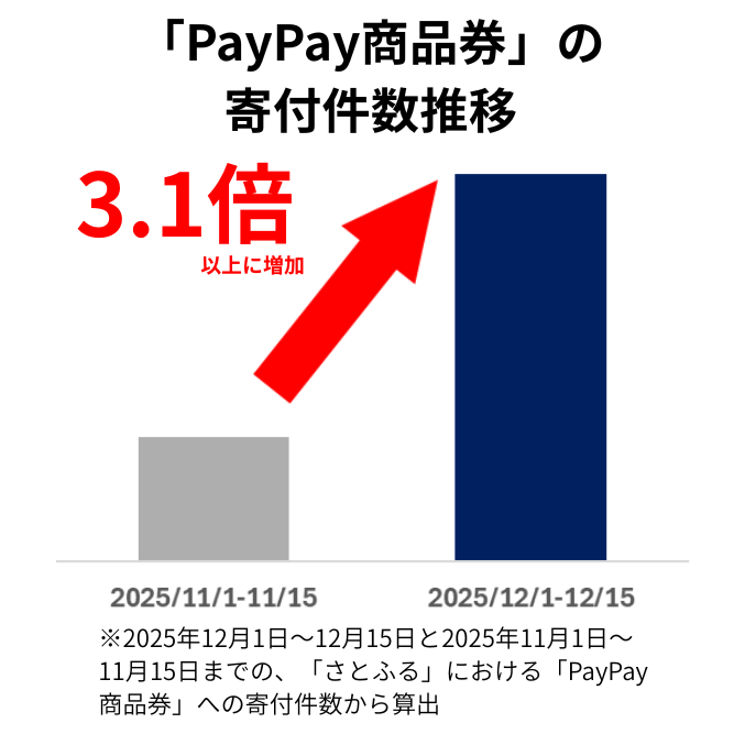 ※6 2025年12月1日~12月15日と2025年11月1日~11月15日までの、「さとふる」における「PayPay商品券」の寄付件数から算出