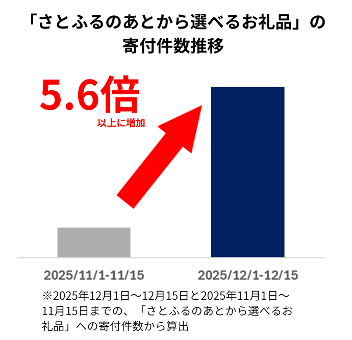 2025年12月前半における「さとふるのあとから選べるお礼品」の寄付件数は、前月同期比で5.6倍以上に増加しました(※5)。年末を前に、まずは寄付を済ませ、年明け以降にお礼品を選ぶ「とりあえず寄付」の動きが加速しています。