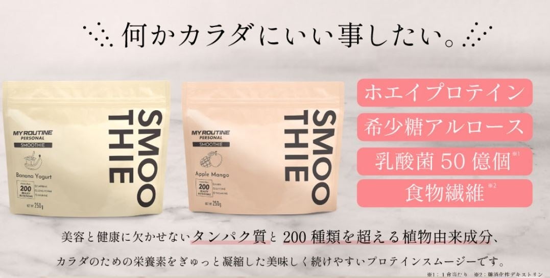 「マイルーティーン パーソナル スムージー」は、すこやかな毎日を目指す、美活サポートのプロテインスムージーです。健康には欠かせないタンパク質と多くの栄養成分をぎゅっと凝縮し、おいしく続けやすいスムージーに仕上げました。腹持ちも良く、置換えダイエットにぴったりです。 ダイエットに興味がある方はもちろん、健康維持や日々の食生活を見直したい方などにもおすすめです。 |