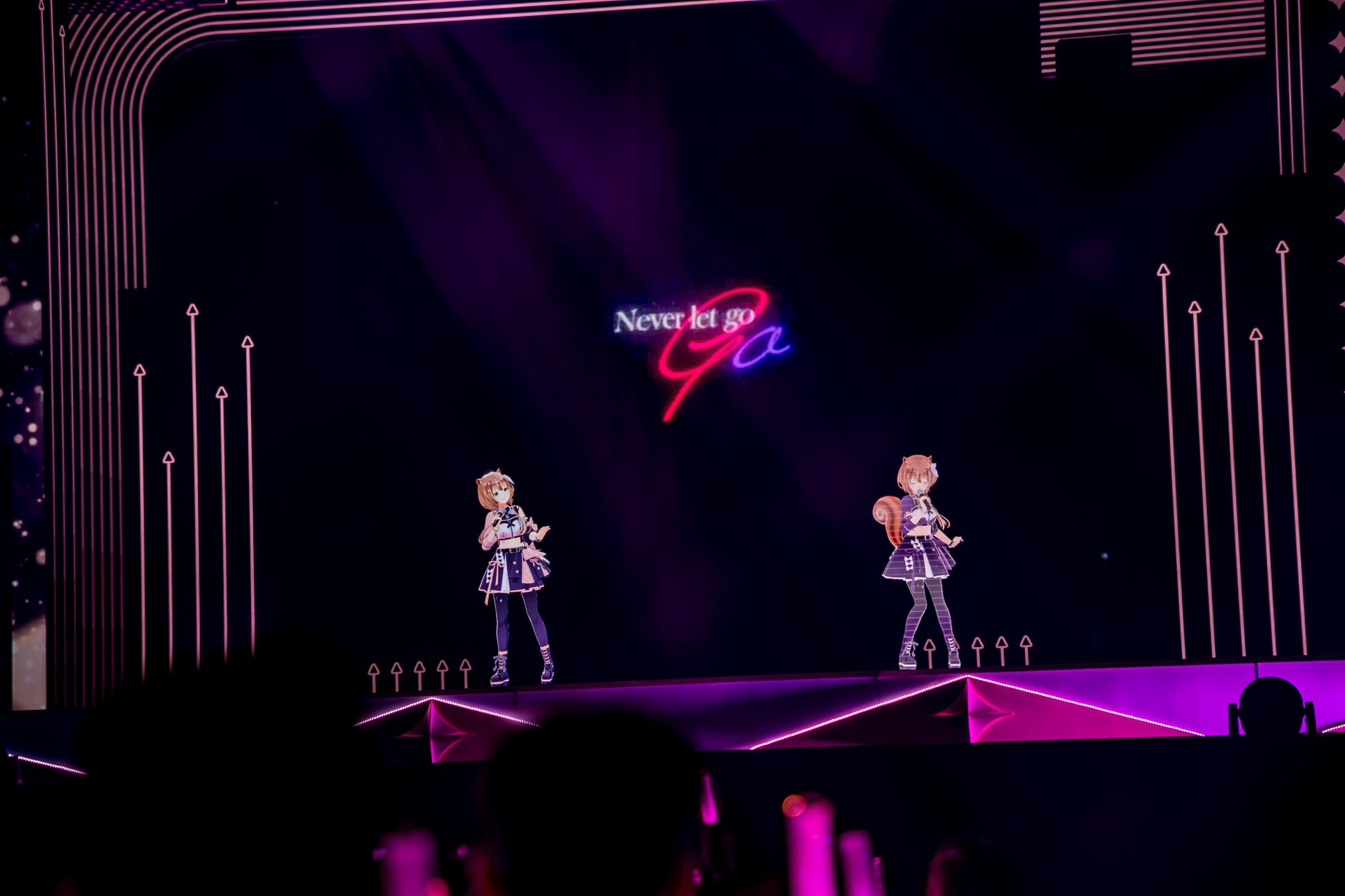 白上フブキは自身の1stソロライブでも感動をもたらした「グローエンブレイス」で、ペンライトに「それぞれの推しの色」をリクエスト。一つひとつ、大切な推しの色が連なって生まれたカラフルな景色は、忘れられないものとなった。演出面で忘れられない演目となったのがアユンダ・リスによるオリジナル曲「MIR//or」。ステージには衣装の色味が異なる2人のリスが登場するが、よく見ると片方は影がなく、姿にもノイズがかかっている。原曲でも展開された2種類の歌声によるセルフデュエットを、今日はリアルタイムで再現した形だ。その美しいハーモニーはもちろん、2人のリスが立ち位置を交代したり、目や手を合わせたりするタイミングも完璧で、ここに至るまで緻密な調整・練習があったことがうかがえる。