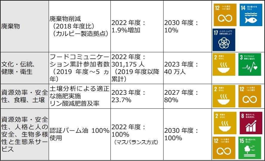 ポジティブ・インパクトファイナンスにおけるカルビーグループが設定したKPI一覧