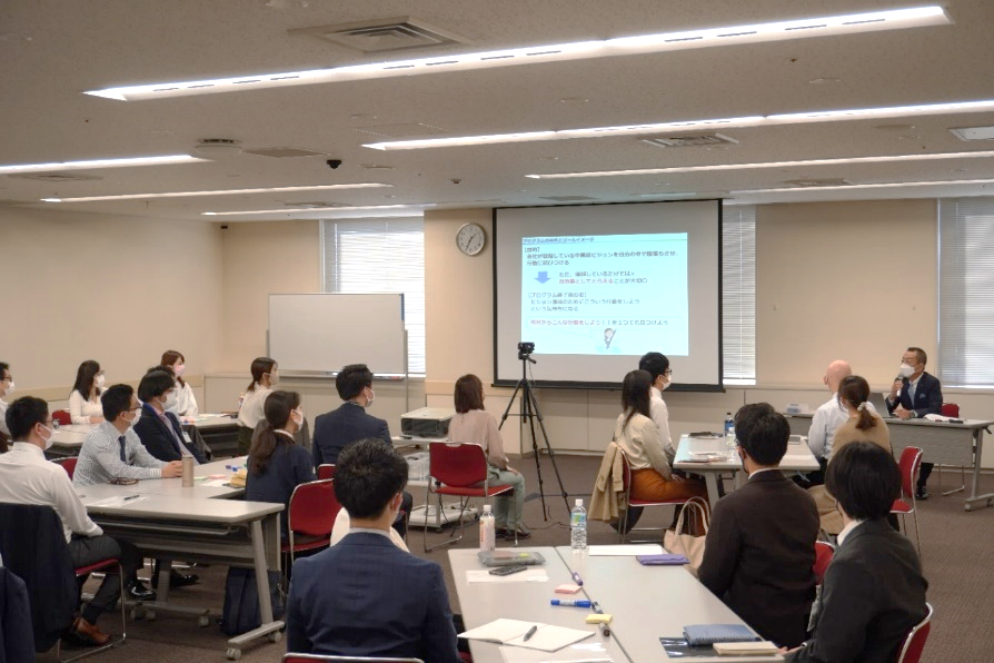 プログラム冒頭には、中期経営計画策定にあたってのトップの想いやビジョン浸透の必要性などを、受講する社員に向けて直接話す機会を設けました。社長が参加できない開催日に関しては、事前に収録した動画を流すことで対応しました。