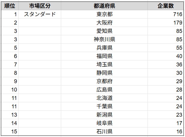 株式会社SalesNow(本社:東京都渋谷区、代表取締役:村岡功規、以下「当社」)は、国内540万社の企業情報を完全網羅した日本最大級のデータベース「SalesNow DB」より、スタンダード市場に上場している企業の都道府県別分布を集計しました。