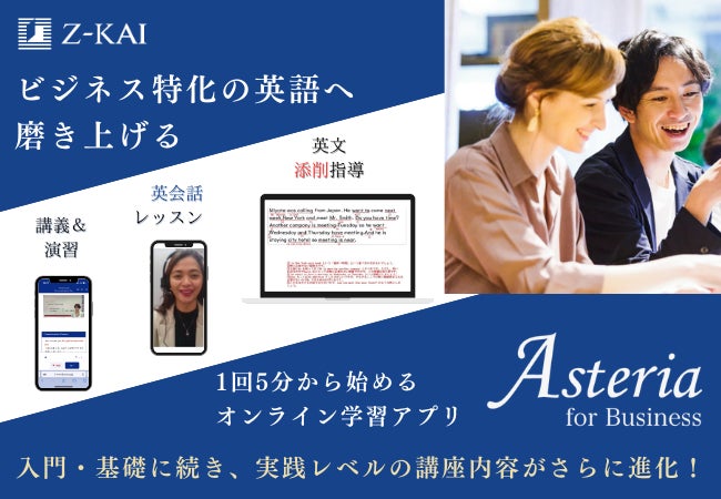 株式会社増進会ホールディングス(Z会グループ)のグループ会社である株式会社Z会は、大学生・社会人向けのキャリアアップコースにおいて、ビジネス英語が学べる講座Asteria for Businessの、実践レベル(CEFR-J:B1.1)のリニューアルを2024年11月7日に行いました。
