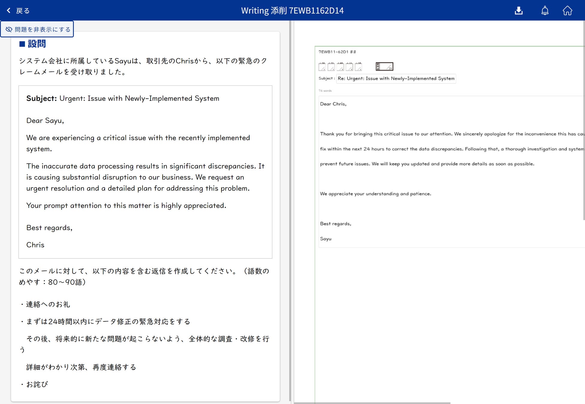 クレームメールへの回答を作成するという、実際の場面を想定したWriting演習です。これまで学習してきた内容や視点が身についているか、実践演習します。