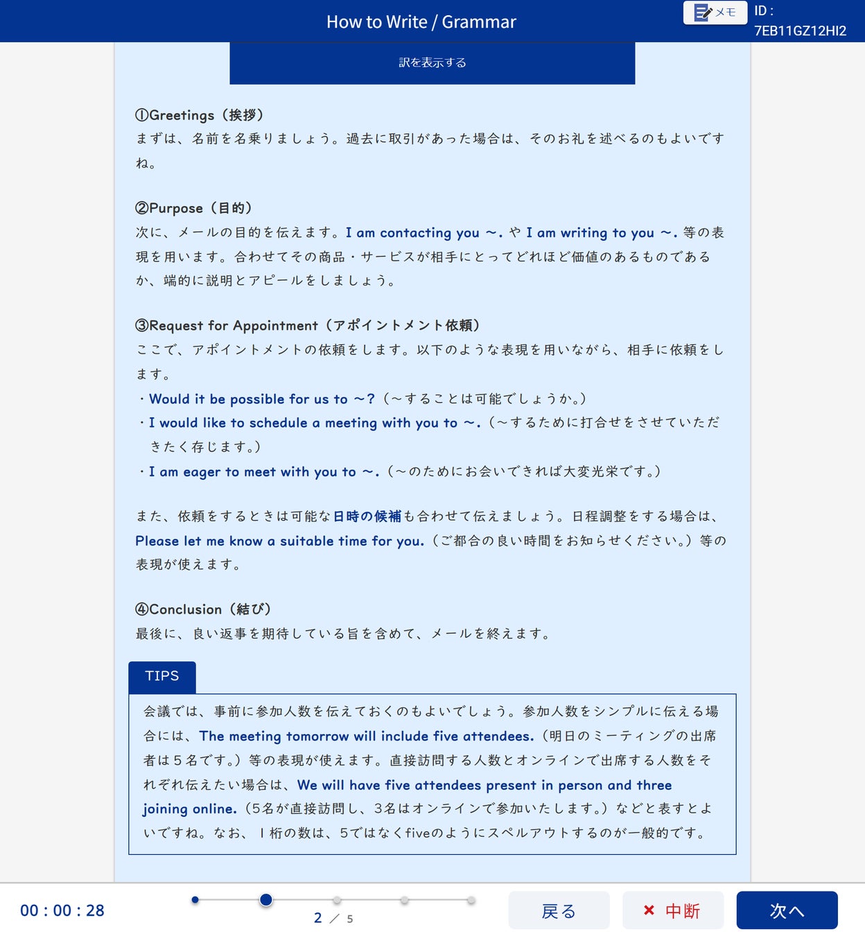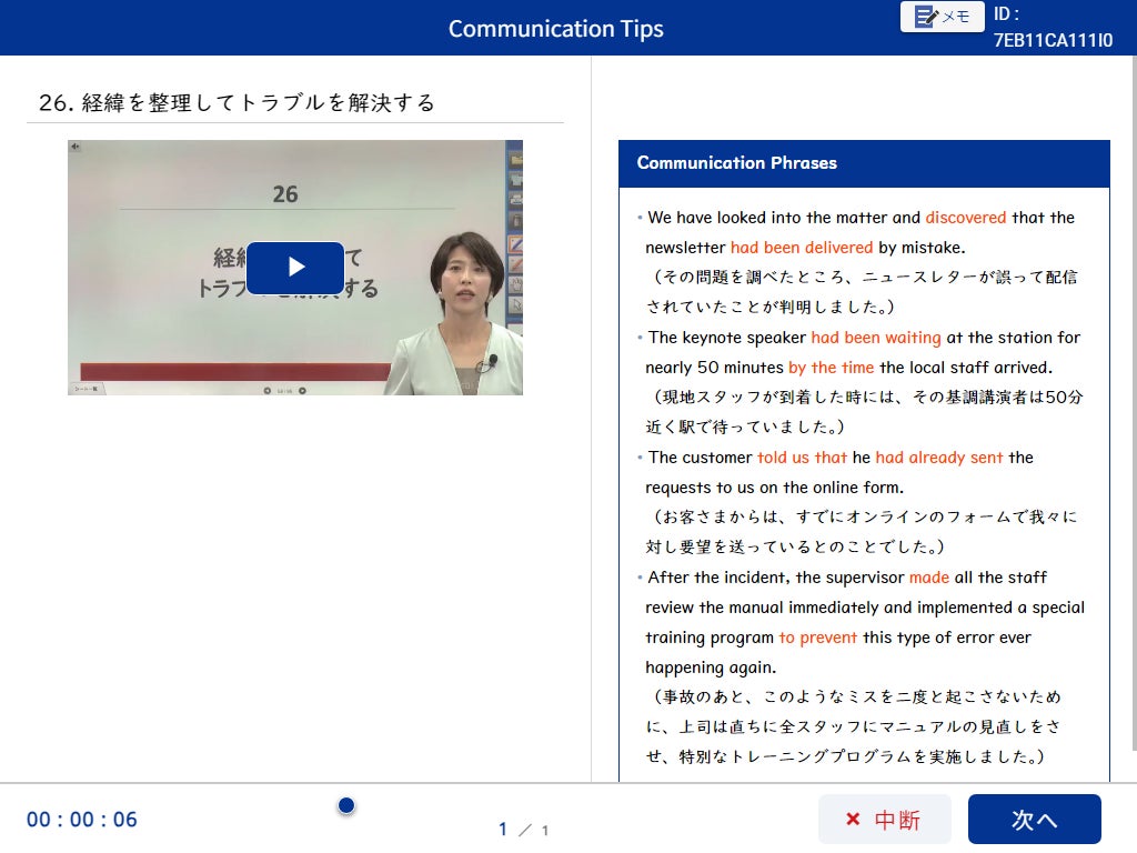 実際の業務における実践的なシチュエーションを取り上げ、ポイントとなる表現や姿勢を講義動画で学びます。