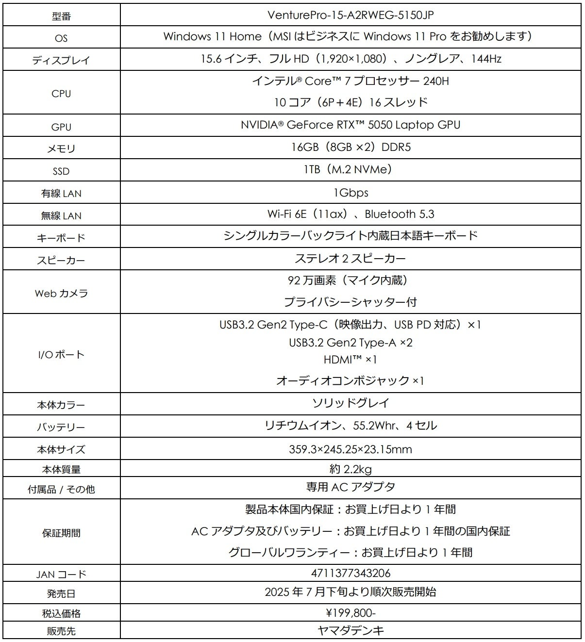 この度、エムエスアイコンピュータージャパン株式会社は、15.6インチの本体に「インテル® Core™ 7 プロセッサー 240H」と「NVIDIA® GeForce RTX™ 5050 Laptop GPU」を搭載したハイスペックノートPC「VenturePro-15-A2RWEG-5150JP」を全国のヤマダデンキで2025年7月下旬より順次販売開始いたします。