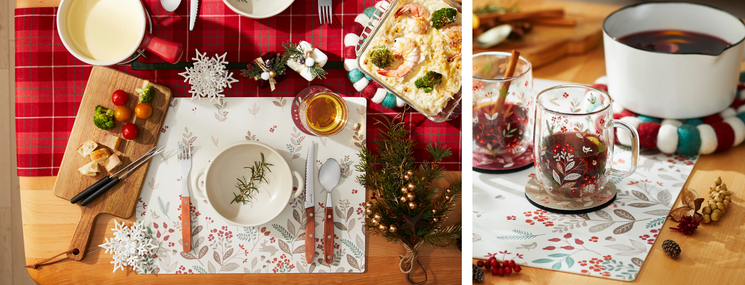 ランチョンマットやマグカップなど手軽に取り入れられるダイニング小物も、おそろいの柄でパーティー気分を盛り上げます。