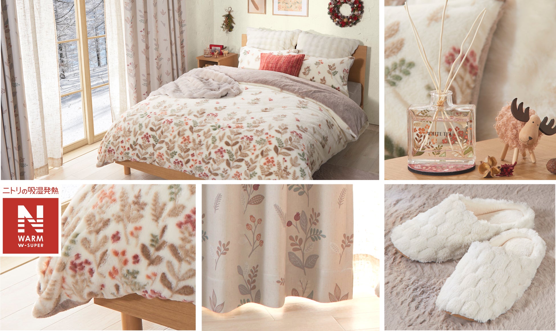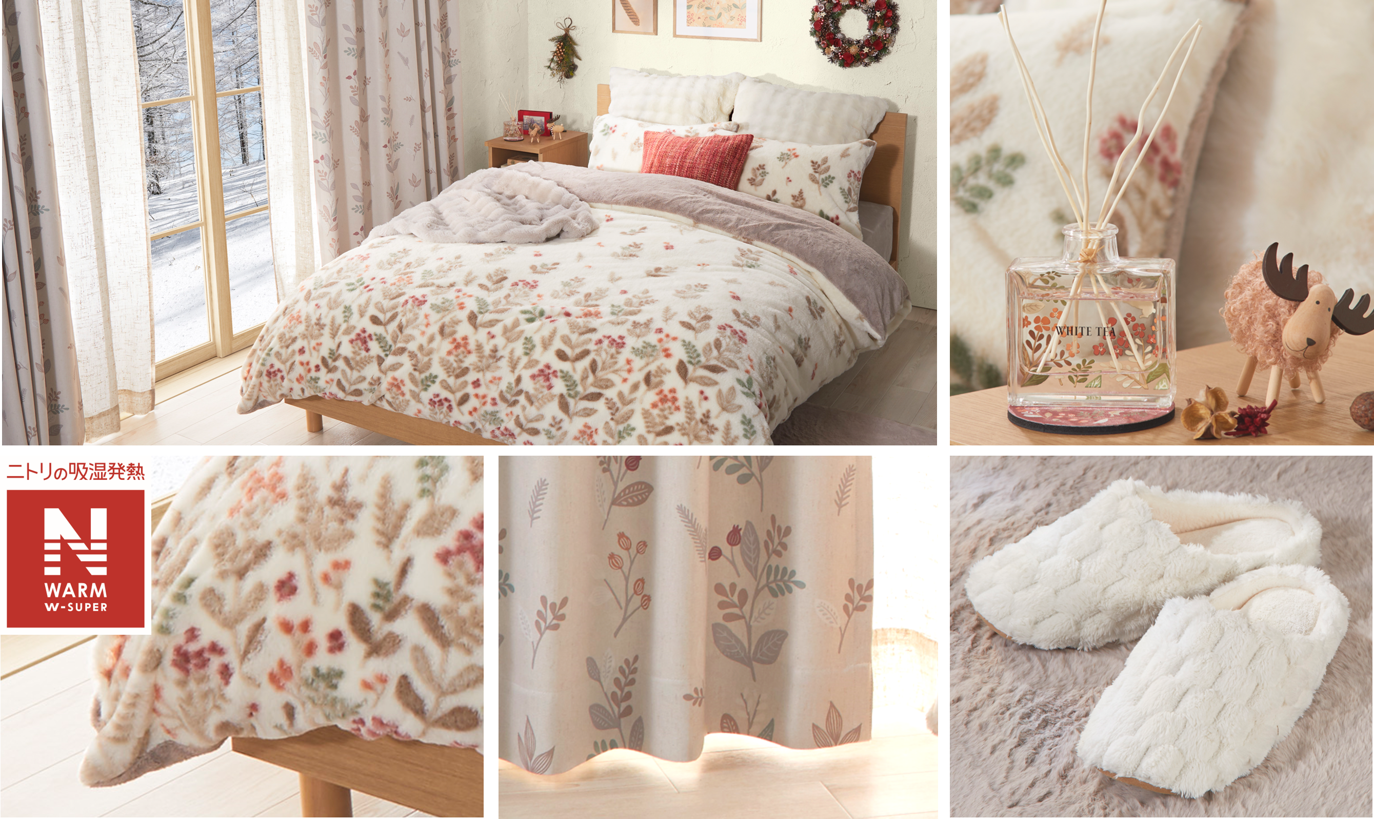 あたたかみのある色使いでお部屋にぬくもりを届けるだけでなく、冷たい外気を遮る遮熱機能付きのカーテン、体からの水分を熱に変える吸湿発熱素材Nウォームのふとんカバーやラグ、ふわふわ素材のクッションカバーなど、毎日をあたたかく快適に過ごせる機能性も備えた冬にぴったりのラインアップです。