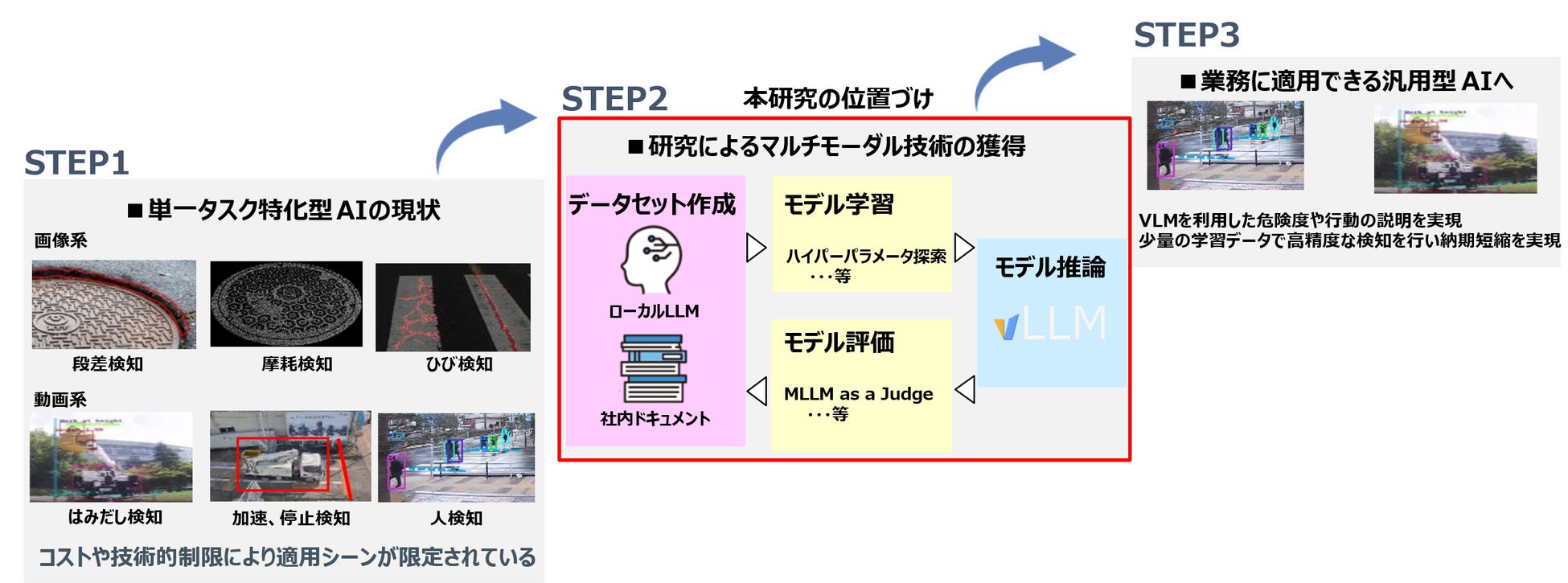 本研究では、画像とテキストの両方を理解できるVLMを活用し、これまで困難だった現場の状況説明や作業指示の自動生成を可能にすることで、安全確認の精度向上を高め、業務プロセスの高度化を図ります。さらに、作業時間の短縮や確認精度の向上により、安全管理業務の効率を従来比で約30%向上させることをめざします。